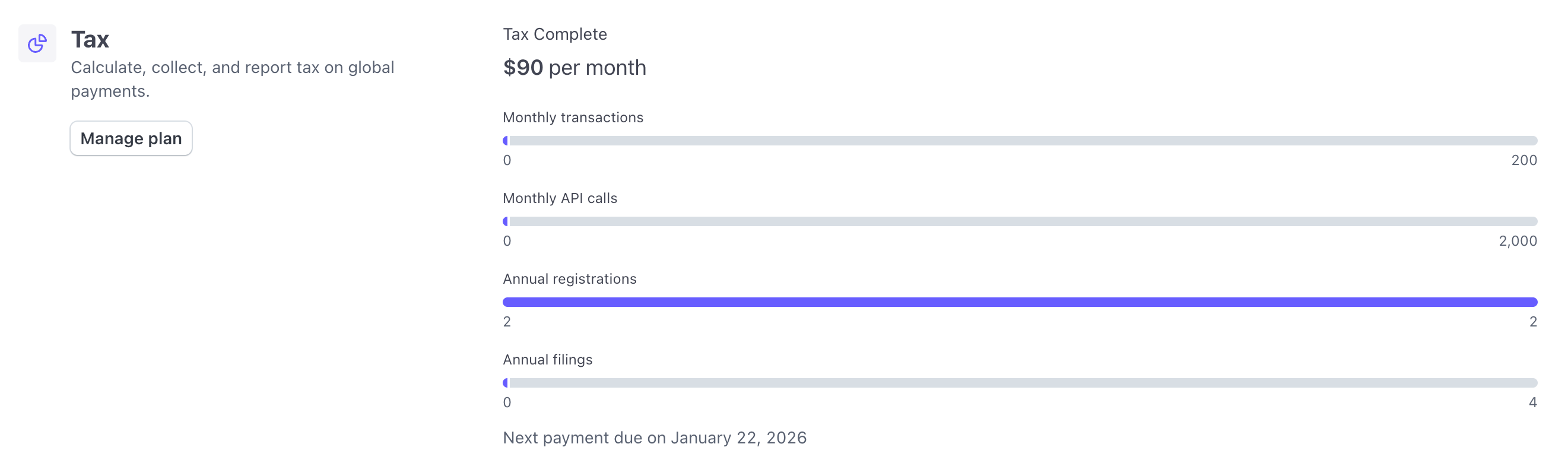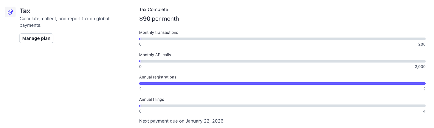 2、Stripe Tax订阅费用,每月90美元,一年1080美元。既然通过Stripe来全球收款,那么在上边处理税务是很方便的。不同的地区有不同的报税门槛。当达到Threshold之后,就必须Register for sales tax, VAT, and GST。