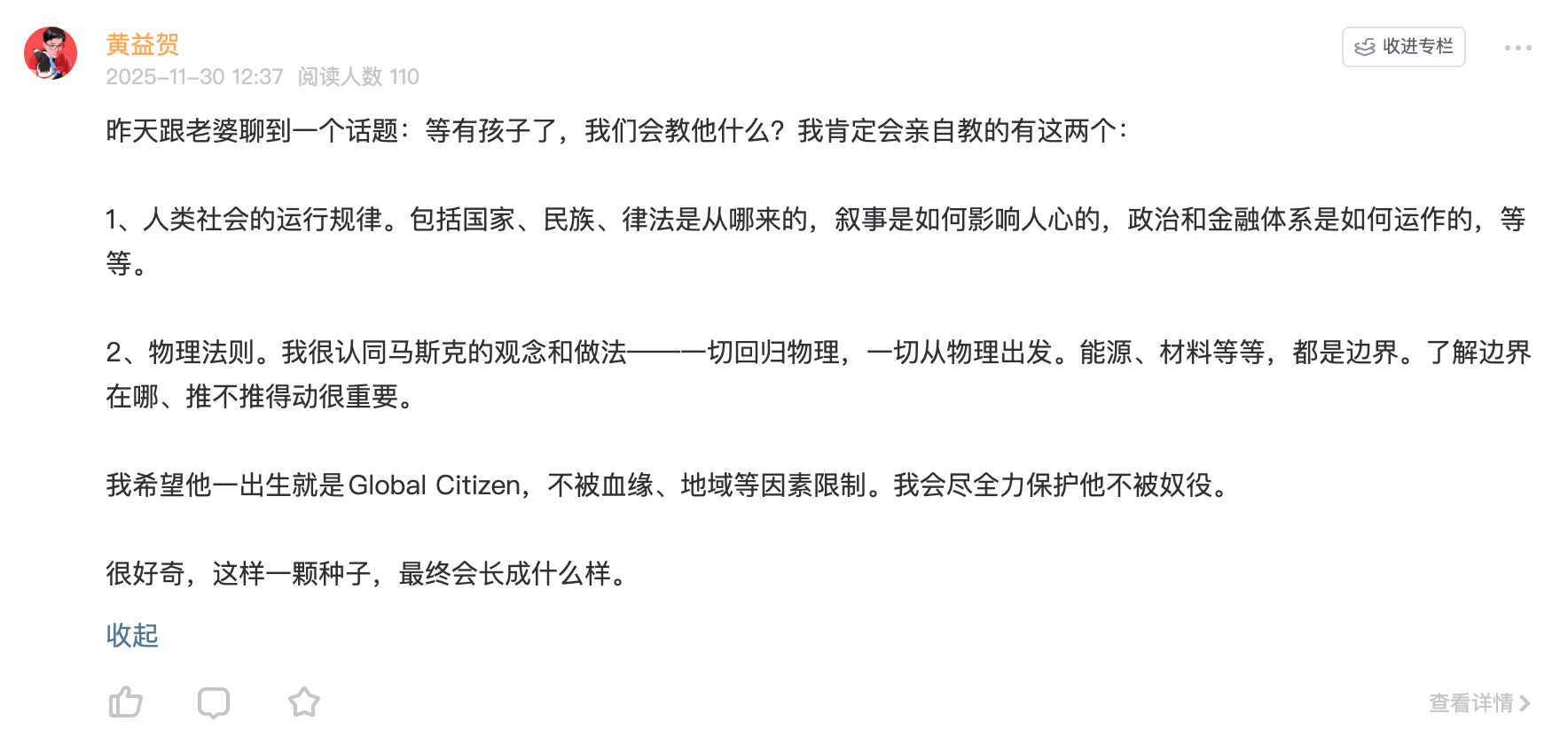 早上我在社群内发了这么个帖子,谈到我想亲自教孩子的两样东西: